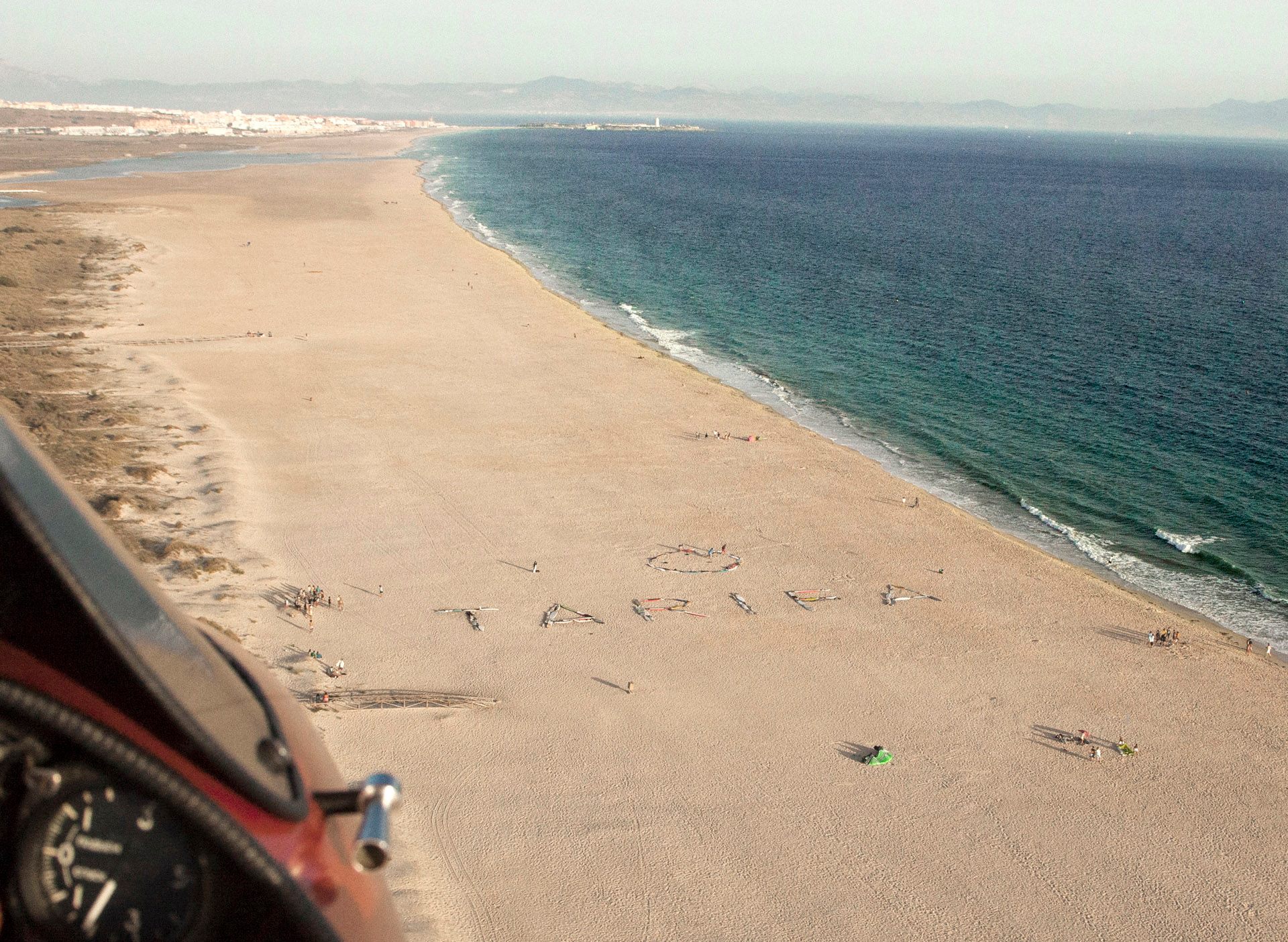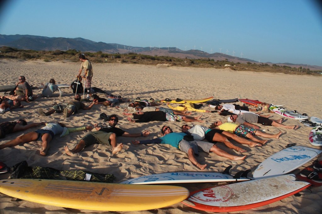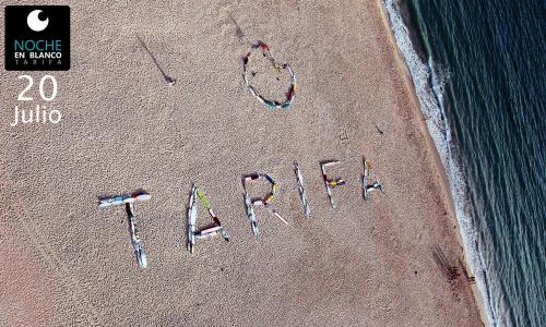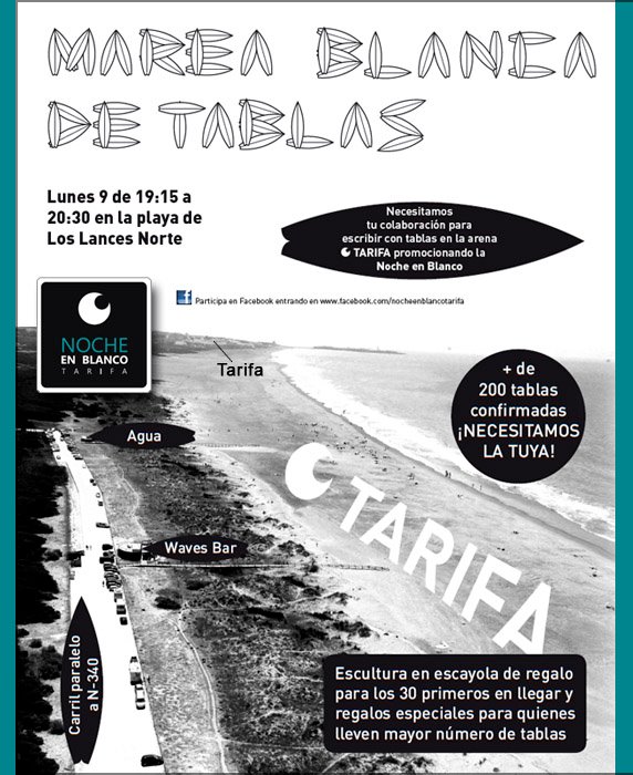 Lunes por la tarde en la hora de puesta de sol, se van hacer una fotografia aéreo de la palabra «Tarifa» escrito en la arena con tablas de surf. Promocionando el evento de nocheenblancotarifa, que se celebra el dia 20 de julio.