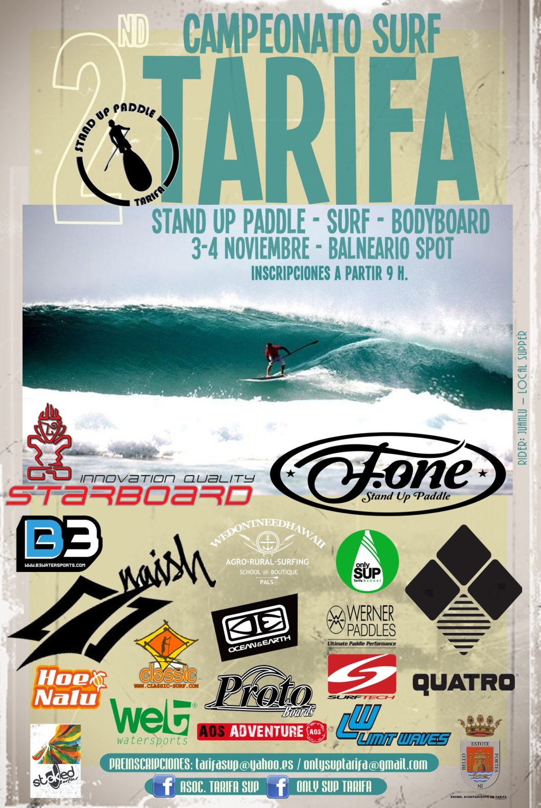 La Asociación Tarifa Stand Up Paddle Surf tiene ya fecha para el campeonato de surf en la playa del Balneario, los días 3 y 4 de noviembre 2012. Categoría de SUP, surf y bodyboard. Masculino y femenino.