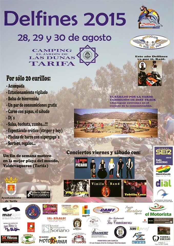 El moto club de Tarifa Al Sur Del Sur organiza por novena vez un fin de semana de concentración motera en Tarifa, playa de Valdevaqueros. DELFINES 2015, con un programa muy atractivo.